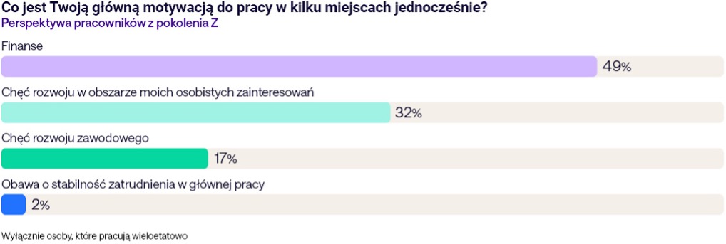 Pokolenie Z ceni sobie możliwość wyboru, elastyczność i innowacyjność. Jeśli można zrobić coś lepiej, łatwiej lub po prostu inaczej, młodzi chętnie to wykorzystają. Podobnymi zasadami kierują się w pracy. Zamiast całego etatu lub stałego zlecenia w jednej firmie, często wybierają współpracę z kilkoma organizacjami w tym samym czasie – w praktyce najczęściej z dwiema (76 proc.) lub trzema różnymi (17 proc.). Wówczas w większości przypadków (63 proc.) żadna z prac nie jest na pełen etat.