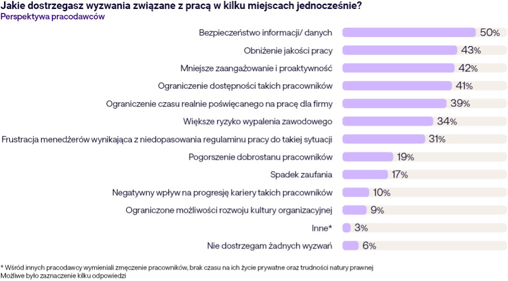 Z kolei dla firm największą słabością takiego rozwiązania są przede wszystkim wyzwania natury prawnej i HR. Główne obawy pracodawców dotyczą bowiem bezpieczeństwa informacji lub danych oraz jakości pracy zaangażowania wieloetatowców. W oczach szefów wyzwaniem może być również ograniczenie dostępności takich pracowników.