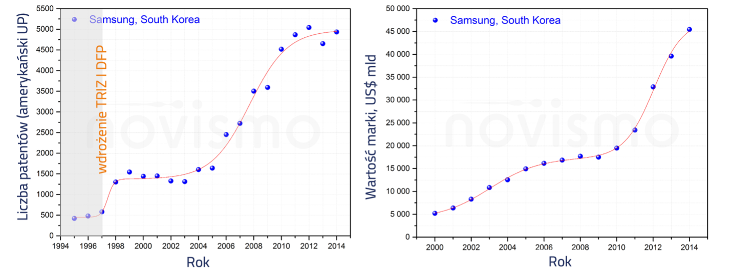 W 1997 r. Samsung uruchomił zakrojony na szeroką skalę program wdrażania Teorii Rozwiązywania Innowacyjnych Zadań (TRIZ) i Design for Patentability (DFP). Spójrz na krzywą na rysunku 1. Przed 1997 r. firma miała około pięciuset amerykańskich patentów rocznie, odnotowując niemal płaską dynamikę wzrostu. Po wdrożeniu nastąpił wykładniczy wzrost – do 2014 r. ponad 5 tysięcy patentów rocznie, dziesięciokrotny wzrost