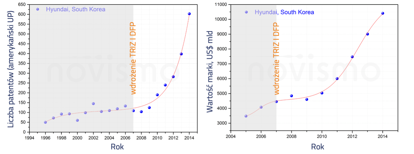 Koncern Hyundai-Kia wdrożył TRIZ i DFP w 2007 r. Zanim do tego doszło, firma osiągała około stu patentów rocznie przez całą dekadę. Krzywa wzrostu wygląda niczym stabilna, niewyróżniająca się firma średniej klasy. Po wdrożeniu nastąpiła eksplozja, sześciokrotny wzrost do sześciuset patentów do 2014 r. Wartość marki podskoczyła z 4 miliardów dolarów do 10 miliardów dolarów, co oznacza trzykrotny wzrost. Ale najbardziej wymowne są ROI poszczególnych projektów: