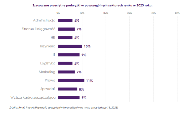 Różnice widoczne są również w wysokości przeciętnych podwyżek. Choć odsetek pracowników, którzy je otrzymali, jest niższy niż rok wcześniej, w wybranych sektorach średnia wysokość podwyżek wzrosła, między innymi dzięki większemu udziałowi podwyżek powyżej 20% (24% w inżynierii i 20% w IT wśród osób, których wynagrodzenie wzrosło w ostatnim roku). Najwyższe przeciętne podwyżki odnotowano w inżynierii i prawie (odpowiednio 10 i 11%), a najniższe w administracji, HR i logistyce (ok. 6%).