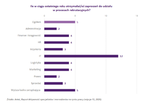 Stabilizacja trendów pozwala dostrzec rosnące zróżnicowanie między sektorami rynku pracy. Najwięcej zaproszeń do procesów rekrutacyjnych otrzymują specjaliści i menedżerowie w branży IT (średnio 12), podczas gdy najmniej ofert trafia do pracowników administracji (2) oraz w tegorocznej edycji badania – prawników. Po raz pierwszy wyraźnie zaznacza się także bardziej niepewna sytuacja marketingowców i logistyków.