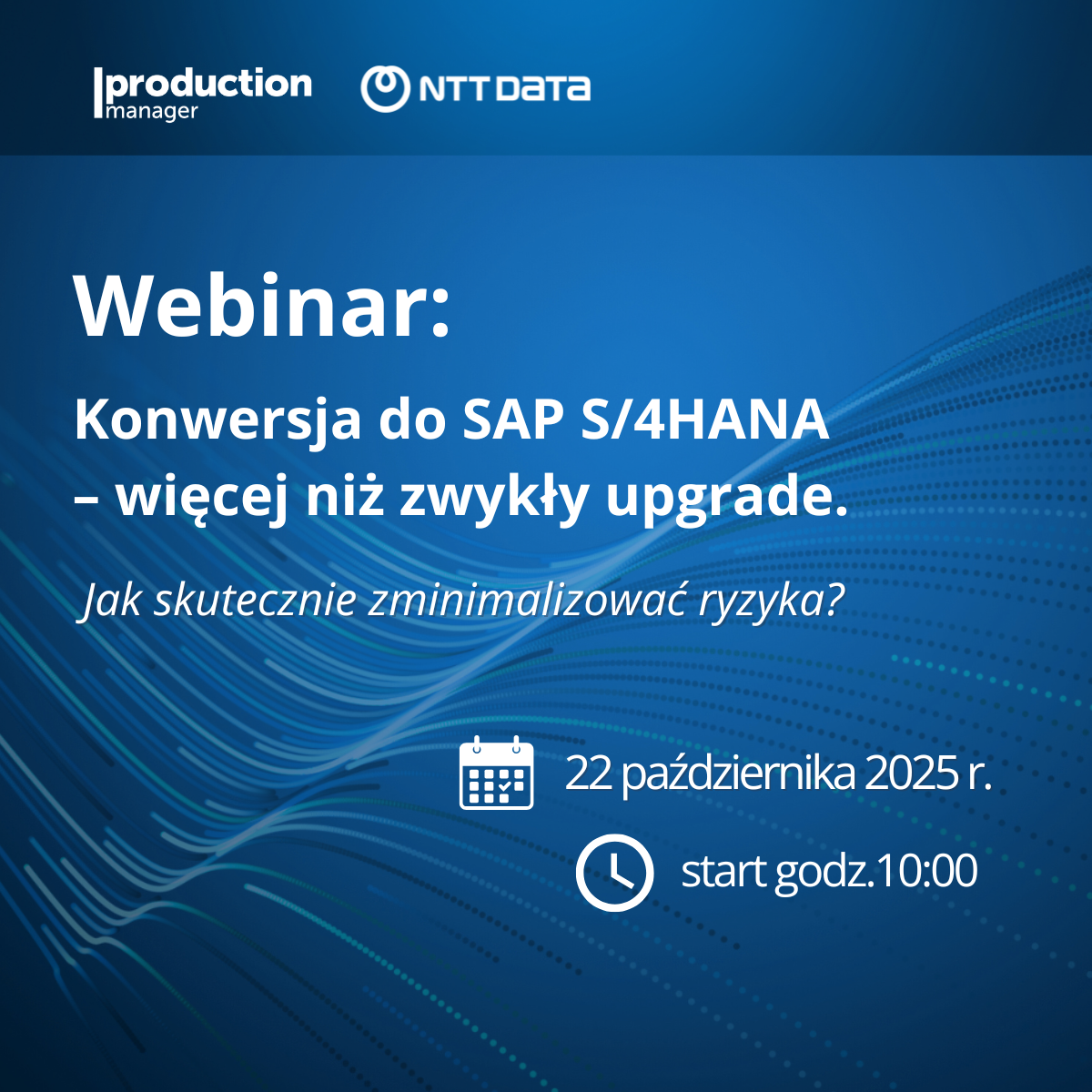 Dowiedz się, jak skutecznie przygotować się do konwersji do SAP S/4HANA i zminimalizować ryzyka projektu. 22 października dołącz do bezpłatnego webinaru Production Managera i NTT DATA Business Solutions. Poznaj etapy konwersji, narzędzia kontrolne i praktyczne wskazówki od ekspertów.