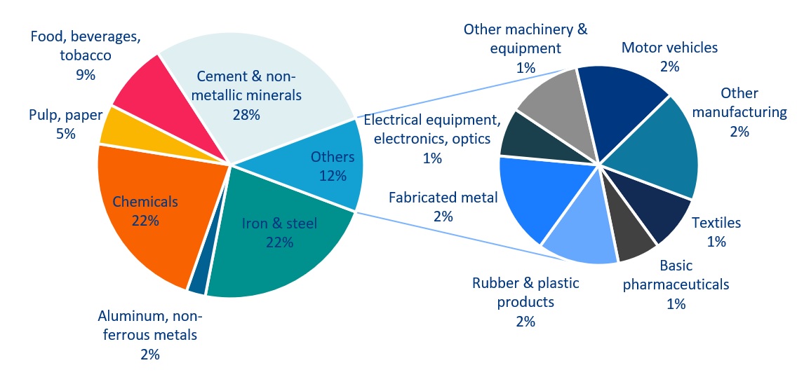 Niemniej jednak sektor ten jest nadal odpowiedzialny za 650 Mt emisji CO2 – przy czym CO2 odpowiada za ponad 90% bezpośrednich emisji gazów cieplarnianych z przemysłu w 2020 r. Sektor cementu, żelaza i stali oraz sektor chemiczny (zob. Wykres 2) mają największy udział w emisji CO2 i przemysłowe zużycie energii: te trzy sektory wygenerowały trzy czwarte emisji przemysłowych w UE-28 w 2020 r.